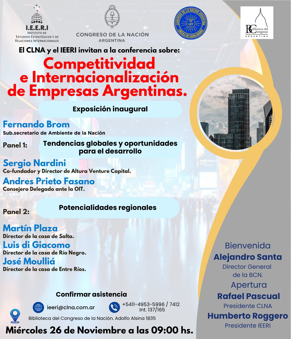 El Congreso de la Nación Argentina fue sede, este miércoles 26 de noviembre a las 9:00, de la conferencia “Competitividad e Internacionalización de Empresas Argentinas”, organizada por el CLNA y el Instituto de Estudios Estratégicos y de Relaciones Internacionales (IEERI). El encuentro reunió a especialistas del ámbito público y privado para debatir tendencias globales, desafíos y oportunidades para el desarrollo productivo del país.
